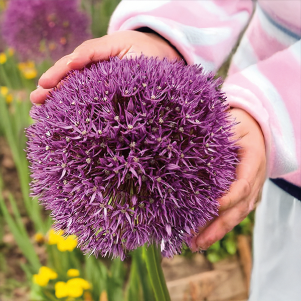 Allium ‘Akita’ je pôsobivý okrasný cesnak a elegantný architekt neskoro-jarného záhona. Okamžite si získa pozornosť svojou výškou a sýtymi, 12 až 15 cm veľkými, tmavofialovými guľovitými súkvetiami, ktoré pôsobia ako umelecké objekty – geometricky presné, a pritom živé a plné pohybu. Dorastá do výšky až 150 cm, čo z neho robí jeden z najvyšších okrasných cesnakov na trhu. Zakvitá v období, keď mnohé jarné cibuľoviny už odkvitli, a tak krásne vyplní miesta a efektne rozžiari priestor.