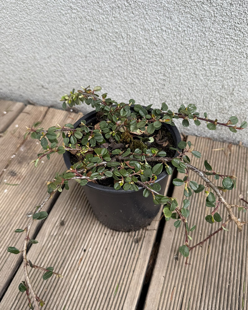 Drobný druh skalníka pôvodom z Himalájí a juhozápadnej Číny. Vyznačuje sa drobnými oválnymi listami, ktoré sú z lícnej strany tmavozelené a lesklé, z rubovej strany sú šedé. Kvety sú bielej farby a objavujú sa bohato na jar. Po odkvitnutí sa postupne tvoria červené bobuľovité plody, ktoré zaujmú od jesene.