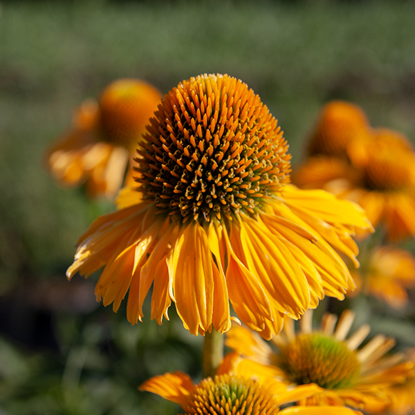 Bohato kvitnúca echinácea s plným kvetom mandarinkovej farby.