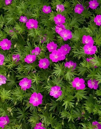 Geranium sanguineum je mimoriadne dlho kvitnúca domáca trvalka, kvitne prakticky od jari až do konca leta. Kvety sú karmínovej farby.