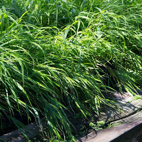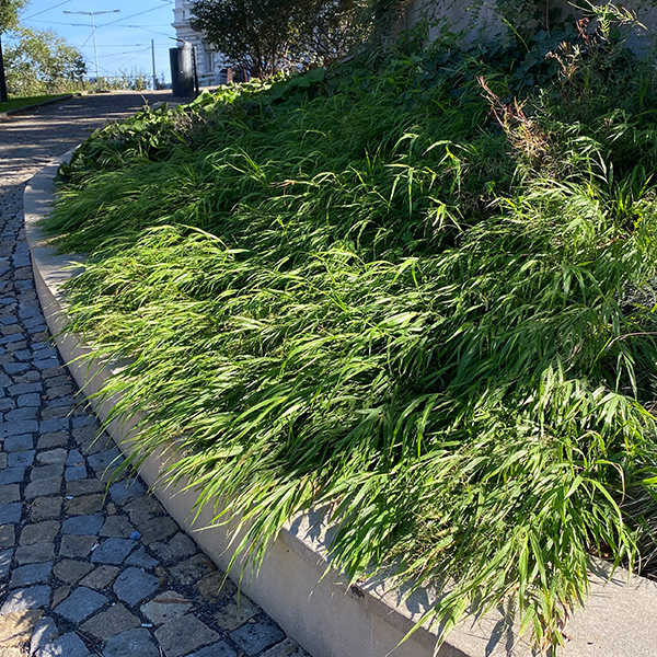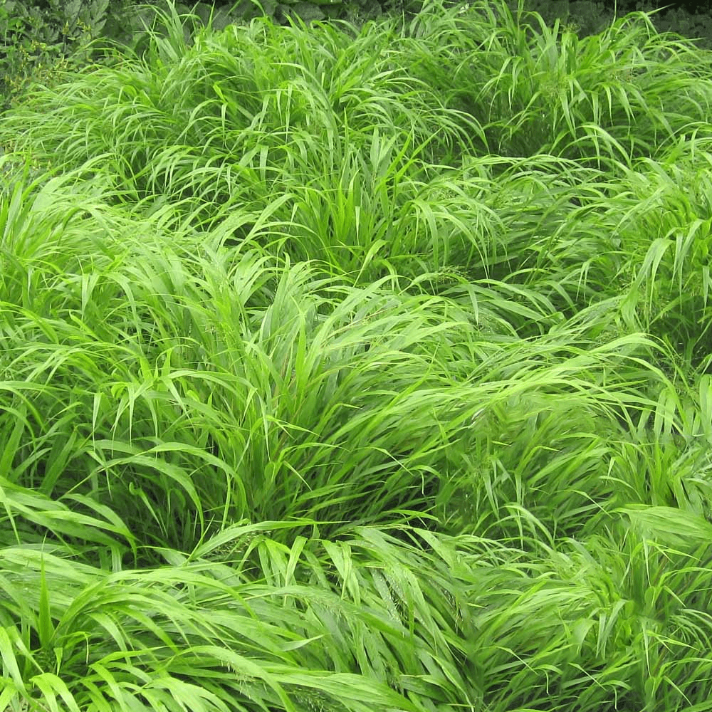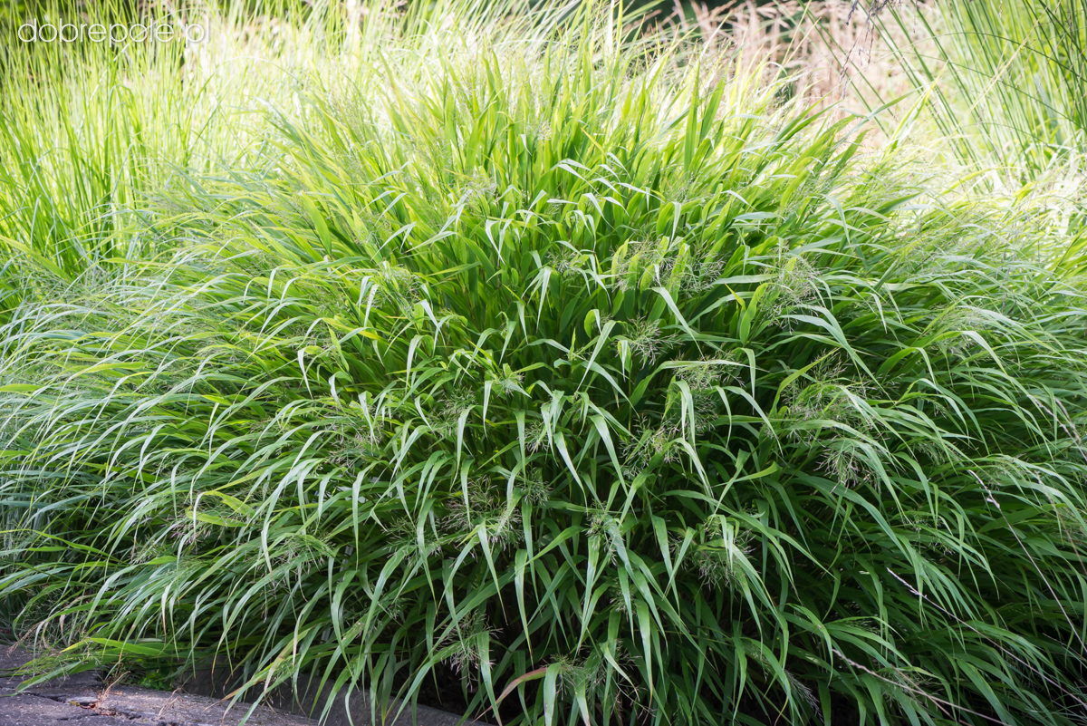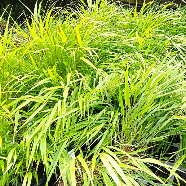 Okrasná tráva, ktorej pôvodný druh rastie v svetlých lesoch a horských trávnikoch Japonska. Vytvára pomaly sa rozrastajúce trsy, širších, prevísajúcich listov.