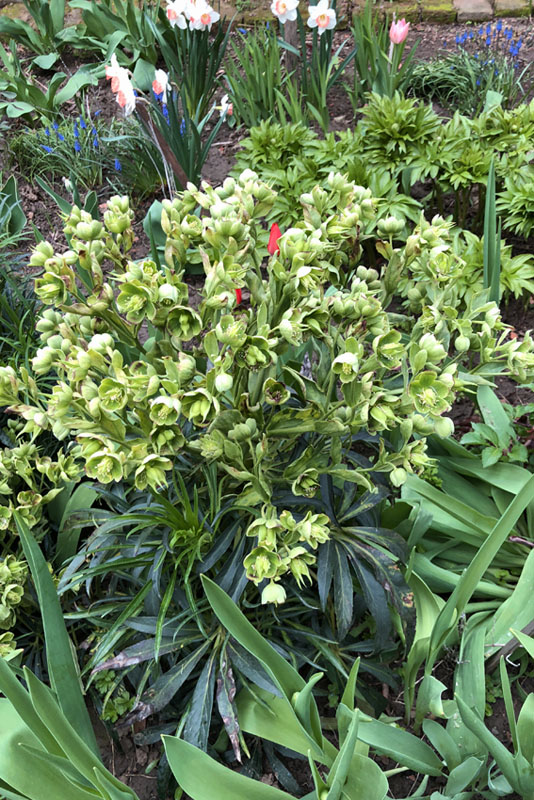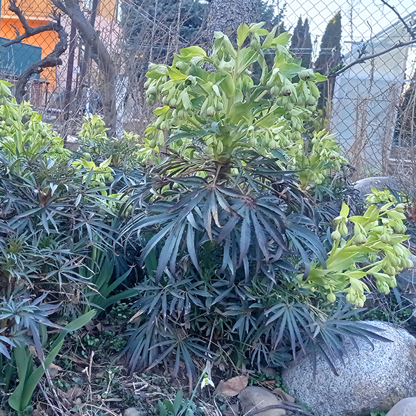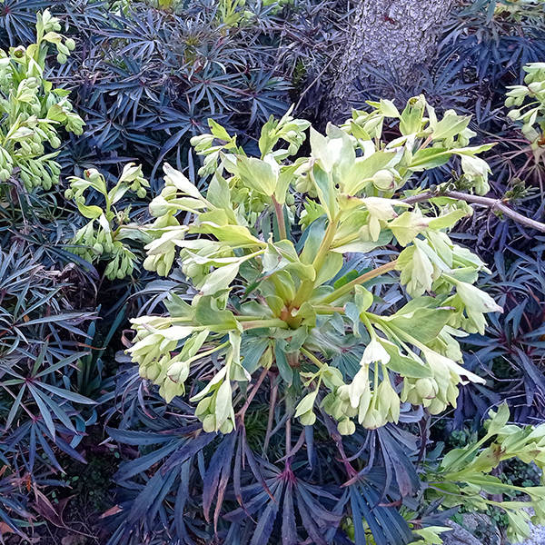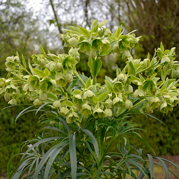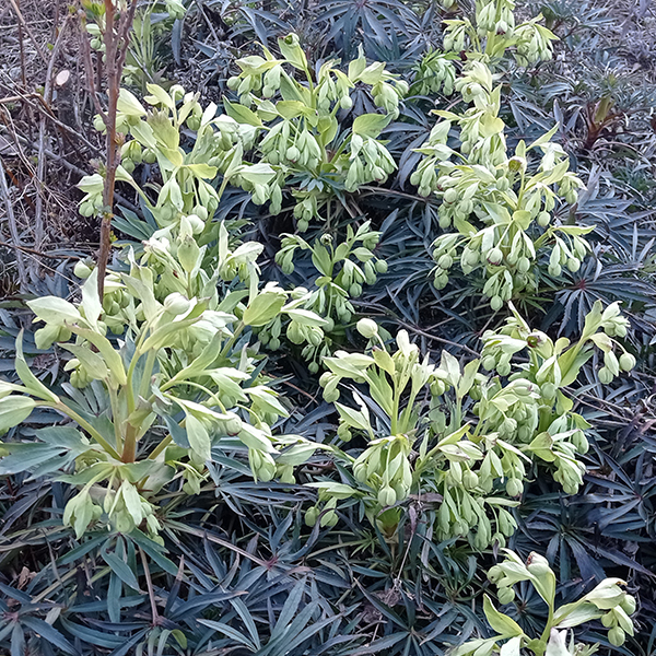Kvety sú žltozelenej farby, menšie no bohato zložené vo vrcholíkatých kvetenstvách. Na rastlinách možno základy kvetov často badať už koncom októbra. Za príhodného počasia možno rozkvitnuté rastliny nájsť na záhradách už v decembri. Inak je hlavným obdobím kvetu február až marec. Kvety pomerne nepríjemne zapáchajú.