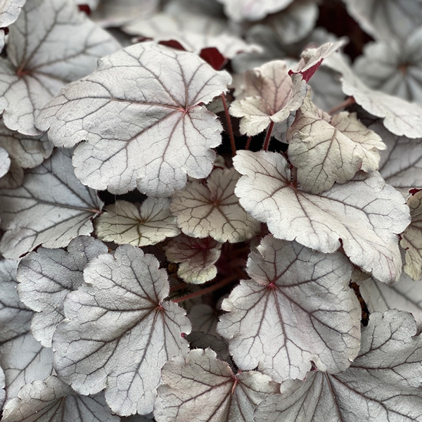 Farebne premenlivá heuchera so striebornou kresbou.