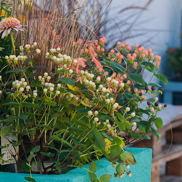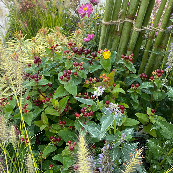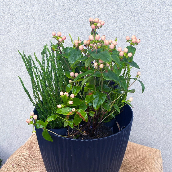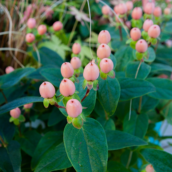 Hypericum 'MIRACLE® BLOSSOM' - ľubovník okrasný žltým kvitnutím a nesmierne malebnými plodmi v rôznych farbách. Plody môžu byť červenej, broskyňovej, bordovej alebo bielej farby. Zapestované rastliny posielame ako mix a farebnosť je preto náhodná.
