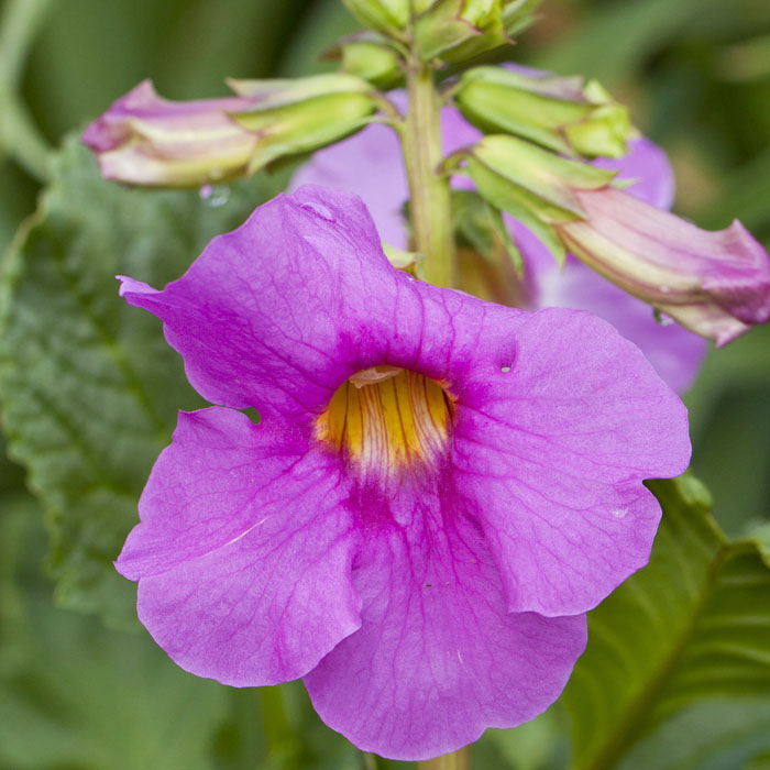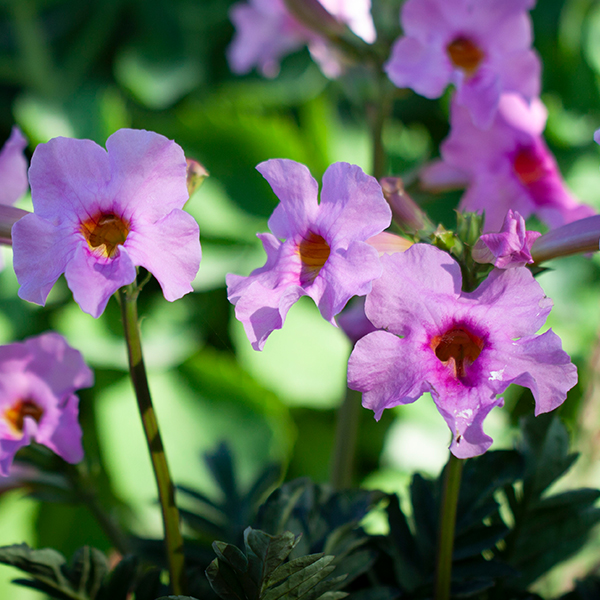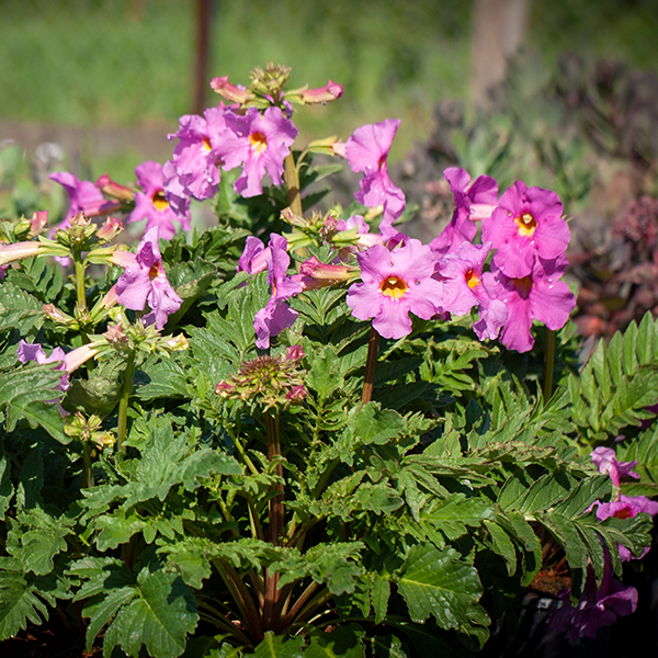Incarvillea delavayi , exotická trvalka s ružovými kvetmi. Vytvára husté trsy mohutných perovitých listov podobné papradi. Kvety sú veľké, trúbkovité, tmavoružovej farby farby. Objavujú sa od konca jari až do druhej polovice leta. Obľubuje slnečné stanovište s humóznymi pôdami. Vďaka zásobným orgánom toleruje i suchšiu pôdu. Hrubé dužinaté korene je vhodné počas vegetácie - a predovšetkým v zimnom období zamulčovať, aby nedošlo k poškodeniu púčikov. Dosahuje výšku 45-55 cm, odolná mrazom do -20 °C za predpokladu chránenia koreňa pred holomrazmi.