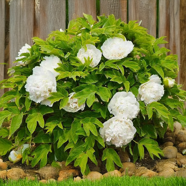 Paeonia × suffruticosa 'Snow Tower' je ako záhradná vízia čistej krásy a tichej elegancie. Jej plné snehobiele kvety, občas s náznakom ružového pohladenia, rozkvitajú v máji až júni a kontrastne ladia s tmavozeleným olistením. Každý kvet je ako veľký výbuch pozitívnej nálady – majestátny, čistý a pôsobivý. Ker dorastá do výšky aj šírky približne 150 cm a vytvára harmonický habitus s pevnými drevnatými stonkami.