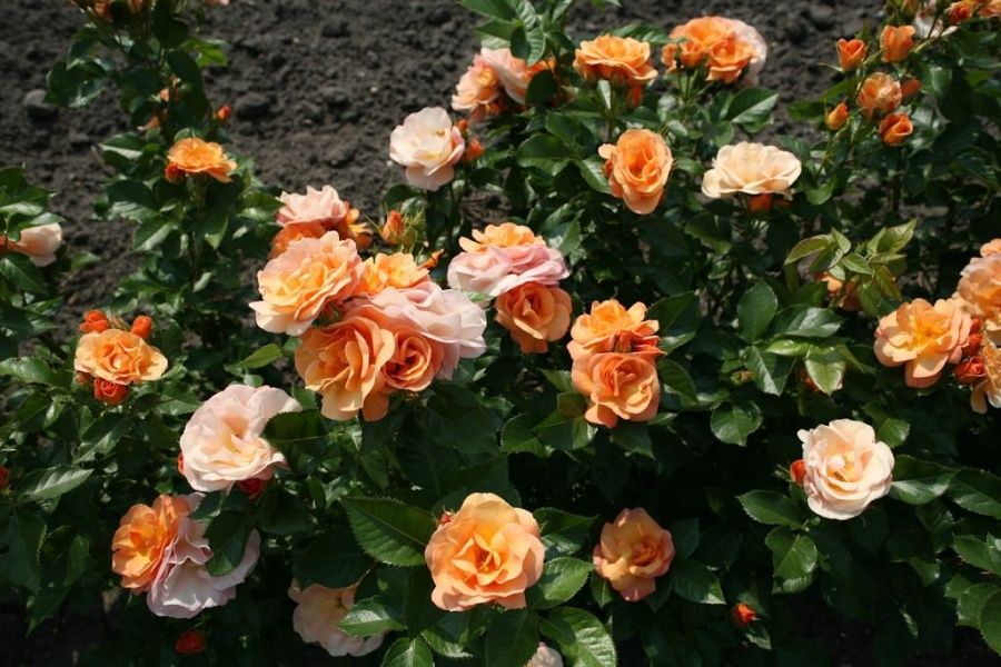 Slnečná oranžová mnohokvetá ruža s drobnejšími kvetmi.