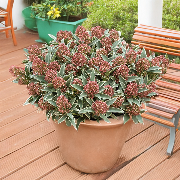 Skimmia japonica ‘Mystic Marlot' je ker, ktorý vnáša do záhrady pôvab počas celého roka. Jej listy sú tmavozelené so svetlým krémovým lemom, takže pôsobia ako jemne orámovaný obraz. Mystic Marlot je dekoratívna aj v zime, keď väčšina rastlín stratí farbu. Už na jeseň sa na rastline objavia púčiky, ktoré majú červený až ružový odtieň a zostávajú ozdobou počas celej zimy. Na jar sa z nich rozvinú voňavé biele kvety, ktoré rozjasnia tienisté kúty záhrady.