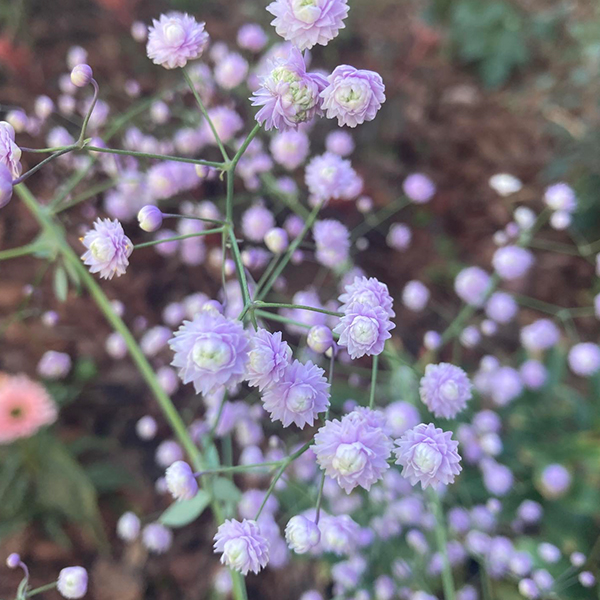 Fialová žltuška s nižším vzrastom a perličkovými kvetmi.