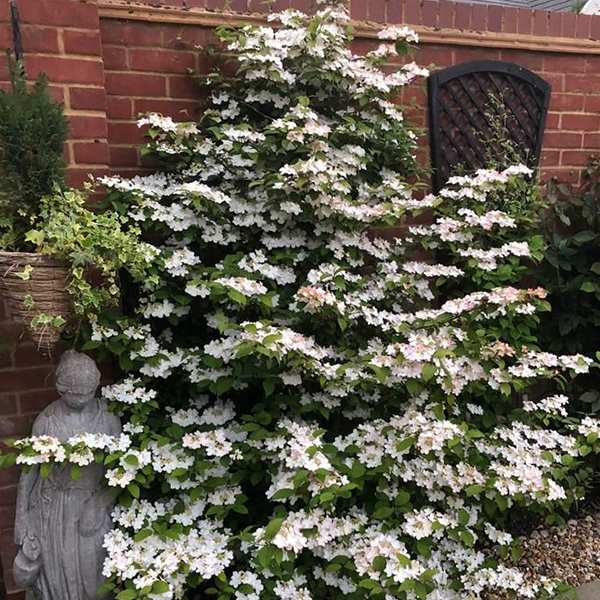 Viburnum plicatum 'Kilimandjaro Sunrise' (kalina japonská) je absolútnou novinkou posledných rokov. Okrasný, približne 1,5 -2, 5 m vysoký ker s horizontálne rozložitým pyramidálnym rastom je dobrým výberom pre použitie do menších záhrad, i do plošne väčších výsadieb. Šírka rastu nepresahuje 200 cm. Konáre nesú tmavozelené, vráskavé listy. Kvitne bohatom koncom jari až začiatkom leta bielymi plocho usporiadanými súkvetiami, ktoré sa skladajú zo sterilných aj fertilných kvetov. Postupne môžu získať ružový nádych. Druhé kvitnutie môže prísť na konci leta. Po príchode jesene nás prekvapí jej svieže, oranžovo-červené prefarbenie listov. Plodí červenými bobuľami v zimných mesiacoch.
